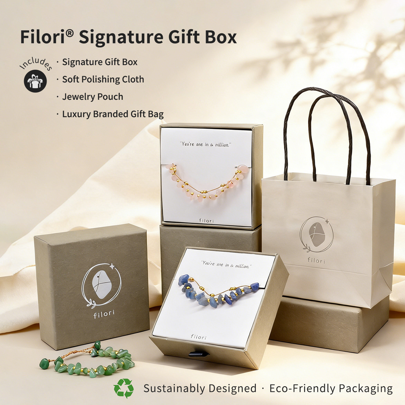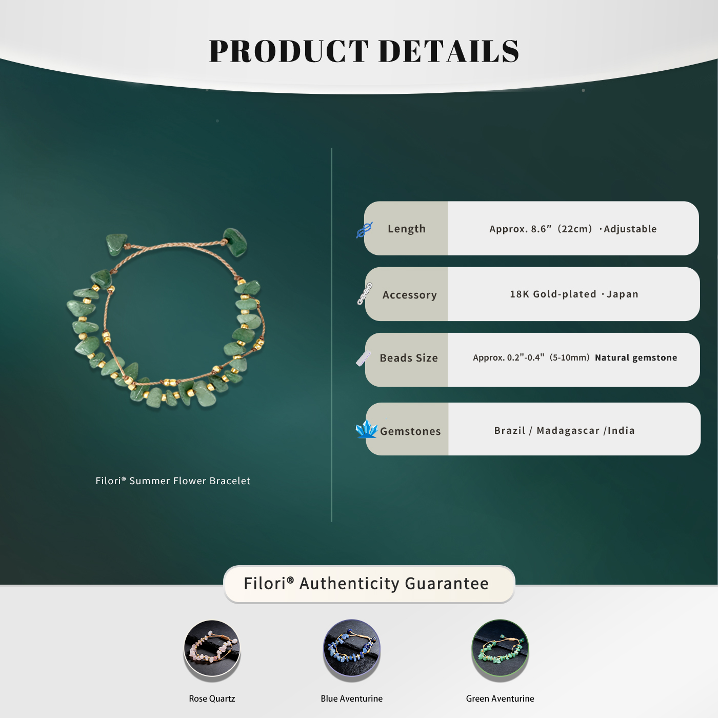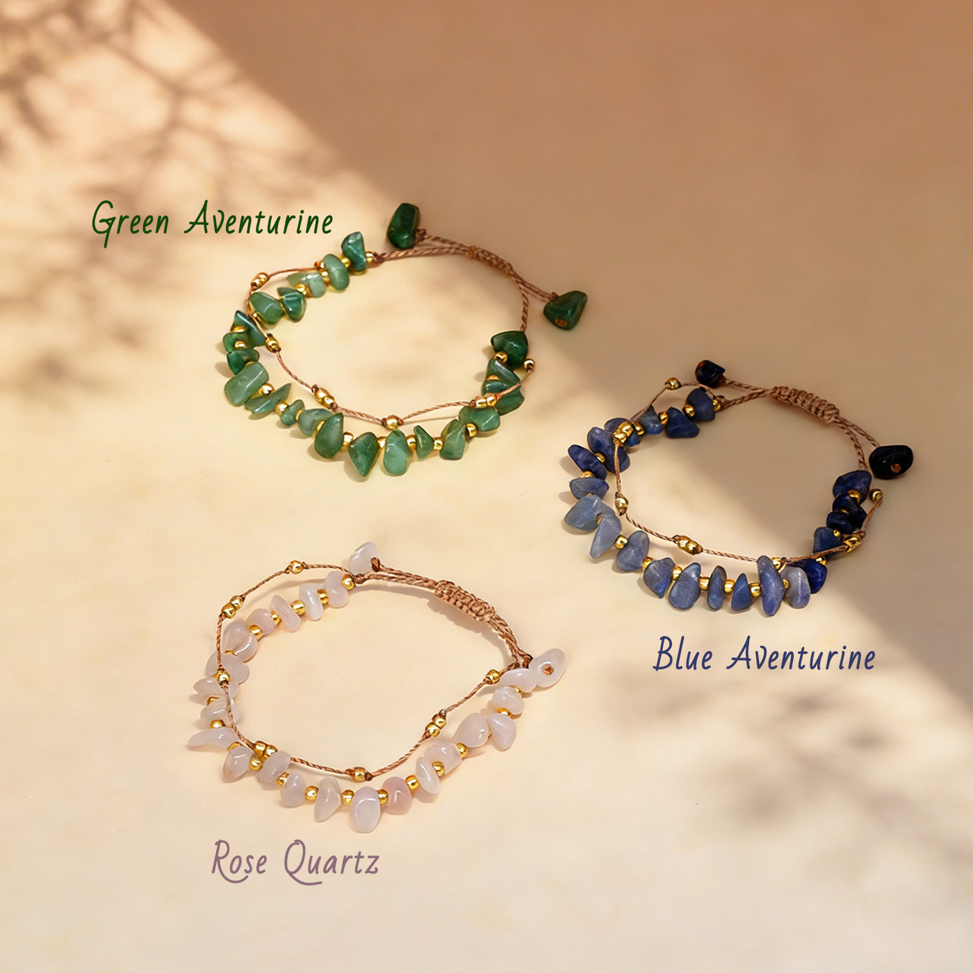 • Rose Quartz: Love · Peace · Emotional Stability • Blue Aventurine: Wisdom · Truth · Inner Power • Green Aventurine: Luck · Abundance · Growth