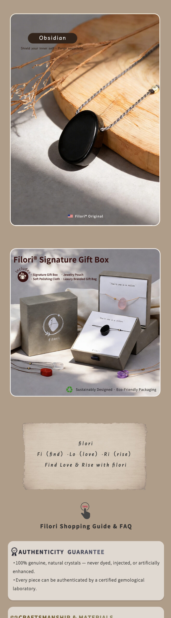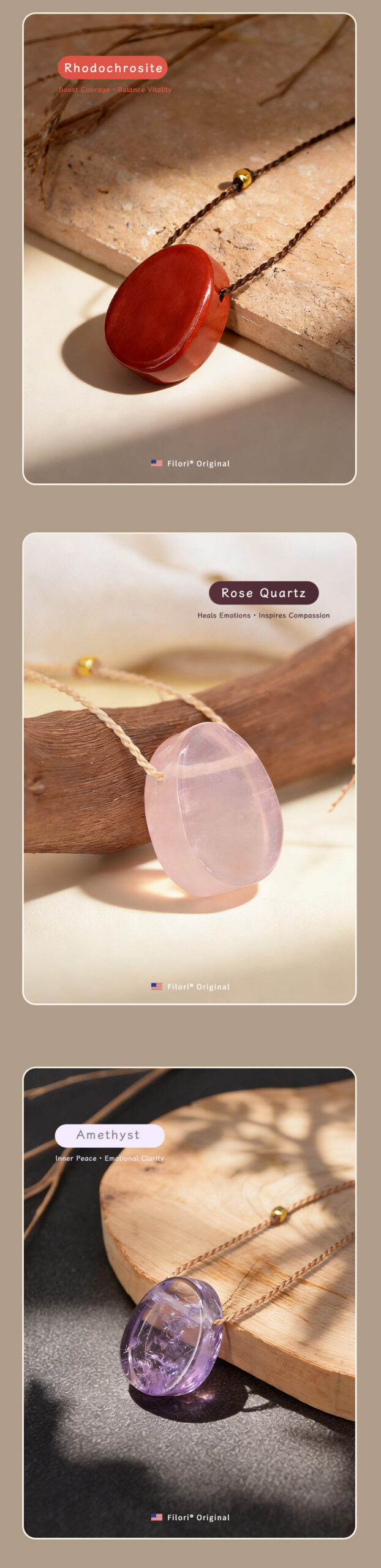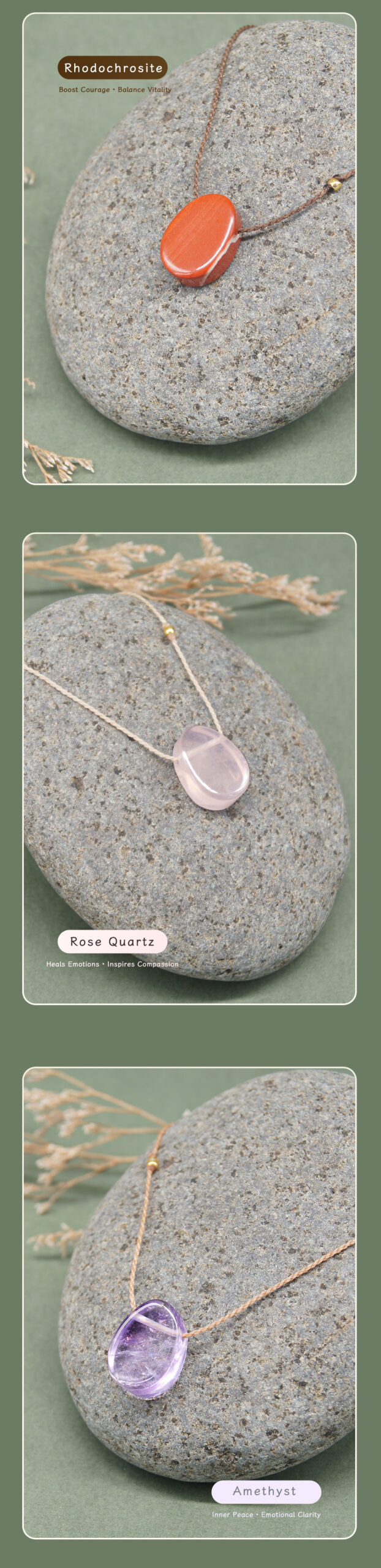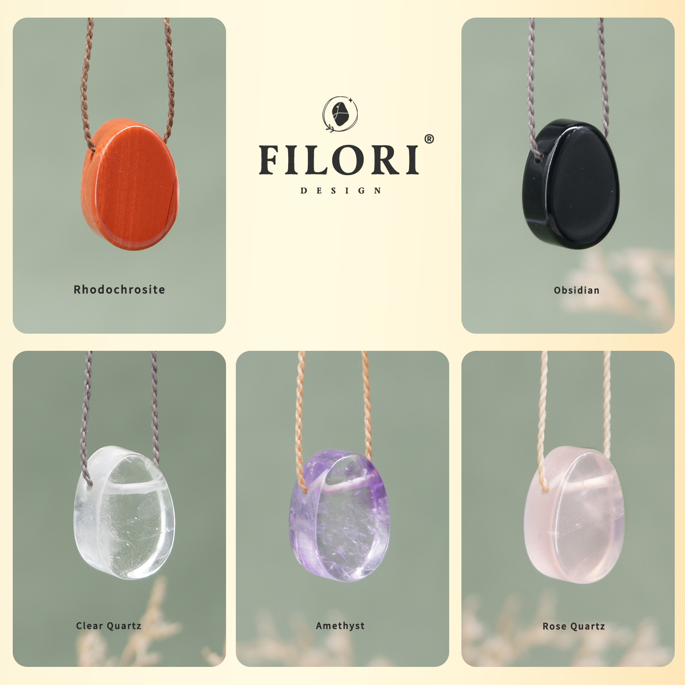 • Clear Quartz: Clarity · Harmony · Energy • Rose Quartz: Love · Compassion · Peace • Amethyst: Calm · Intuition · Balance • Obsidian: Protection · Strength · Grounding • Rhodochrosite: Joy · Healing · Self-Love