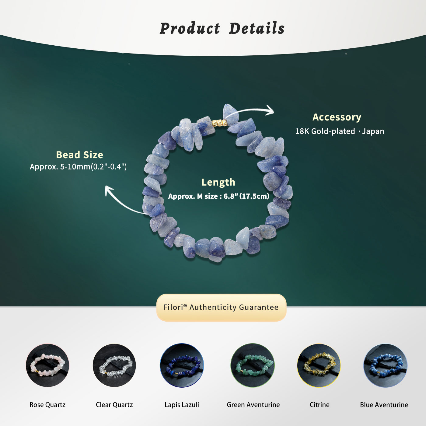 • Lapis Lazuli: Wisdom · Truth · Inner Power • Clear Quartz: Calm · Focus · Clarity • Green Aventurine: Luck · Abundance · Growth • Blue Aventurine: Luck · Abundance · Growth • Rose Quartz: Love · Peace · Emotional Stability • Citrine: Joy · Energy · Confidence