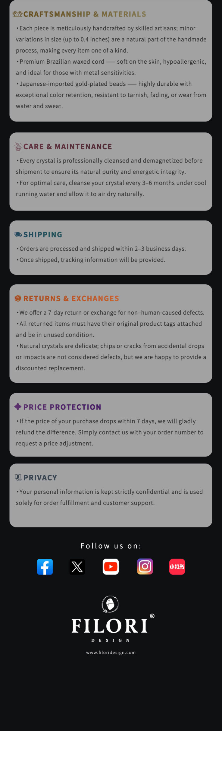 ✧ Material: 100% natural crystal, approx. 1″× 0.3″ (2.7 × 0.7 cm) ✧ Accent Beads:18 K gold-plated (Japan) ✧ Cord: Premium Brazilian wax cord, hand-braided ✧ Adjustable Length: Up to 31.5″ (80 cm), with sliding knot ✧ Packaging: Comes with a gift box and energy meaning card