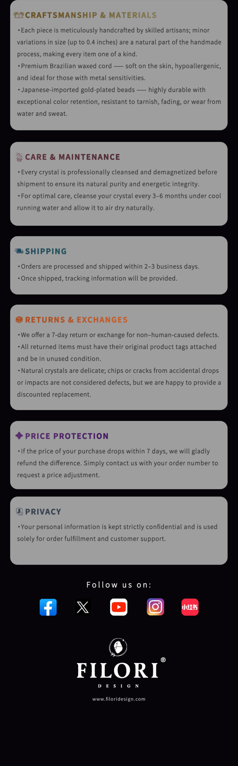 ✧ Material: 100% natural crystal, approx. 1″× 0.3″ (2.7 × 0.7 cm) ✧ Accent Beads:18 K gold-plated (Japan) ✧ Cord: Premium Brazilian wax cord, hand-braided ✧ Adjustable Length: Up to 31.5″ (80 cm), with sliding knot ✧ Packaging: Comes with a gift box and energy meaning card