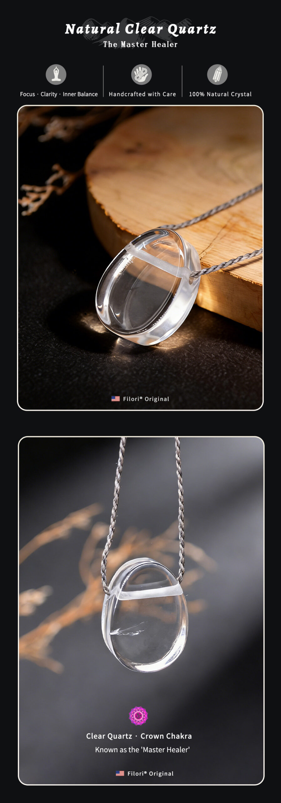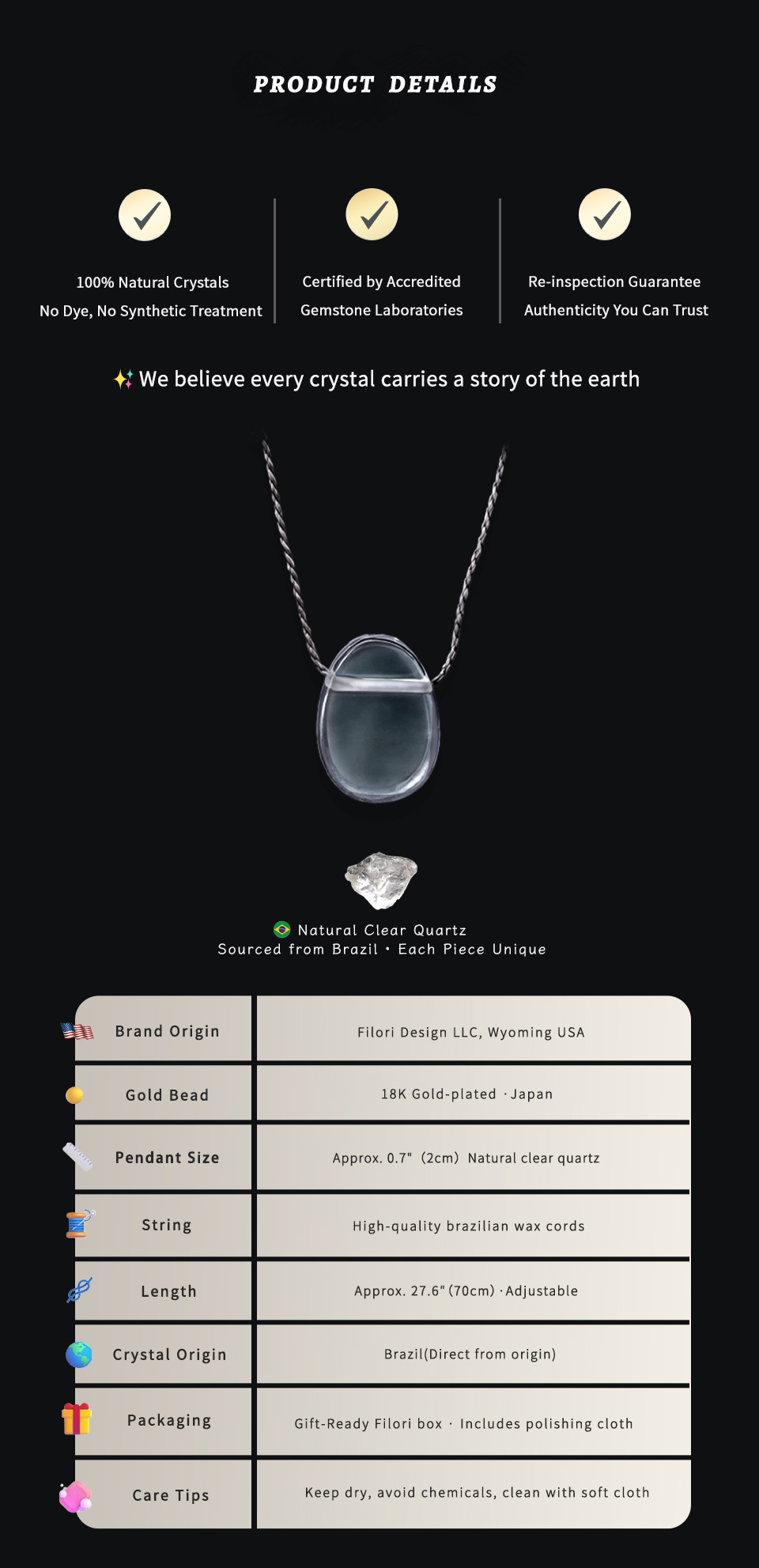 ✧ Material:100% natural Crystal (approx. 1.5–2.0 cm per pendant) ✧ Accent Bead:18 K gold-plated (Japan) ✧ Cord: hand-braided, Premium Brazilian wax cord ✧ Adjustable Length: Up to 27.6″ (70 cm), sliding knot design ✧ Packaging: Gift box & gemstone meaning card included