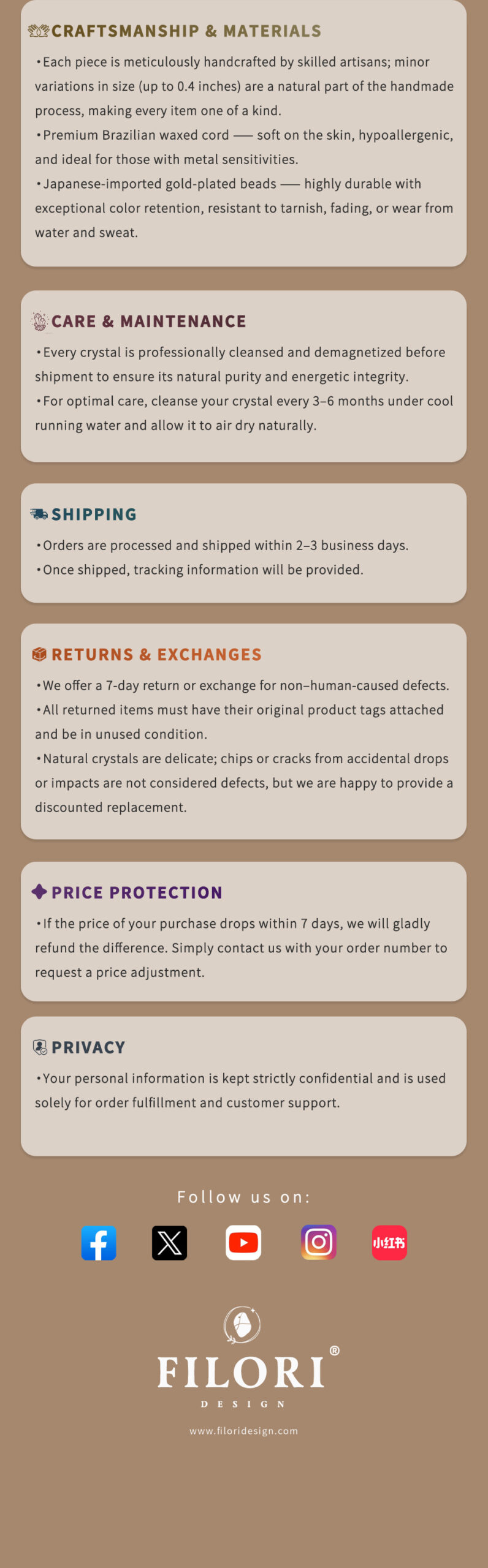 ✧ Material:100% natural Crystal (approx. 1.5–2.0 cm per pendant) ✧ Accent Bead:18 K gold-plated (Japan) ✧ Cord: hand-braided, Premium Brazilian wax cord ✧ Adjustable Length: Up to 27.6″ (70 cm), sliding knot design ✧ Packaging: Gift box & gemstone meaning card included