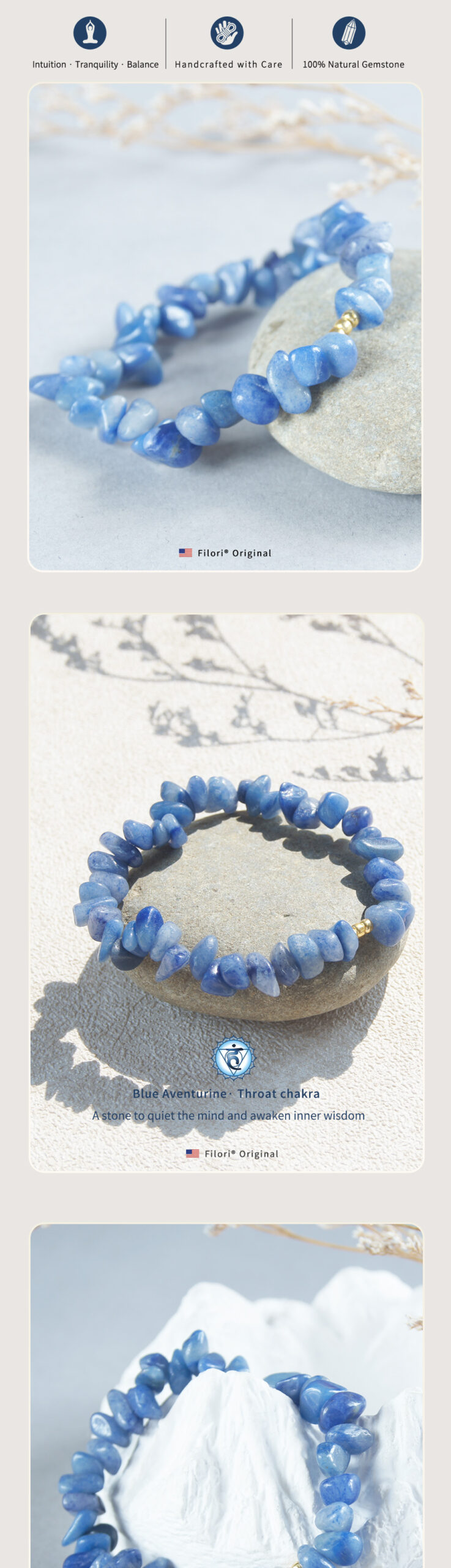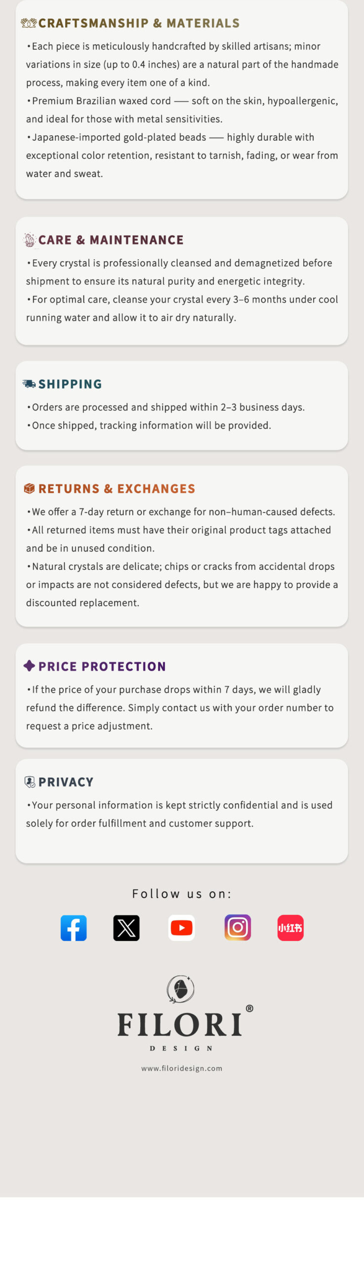 • Lapis Lazuli: Wisdom · Truth · Inner Power • Clear Quartz: Calm · Focus · Clarity • Green Aventurine: Luck · Abundance · Growth • Blue Aventurine: Luck · Abundance · Growth • Rose Quartz: Love · Peace · Emotional Stability • Citrine: Joy · Energy · Confidence