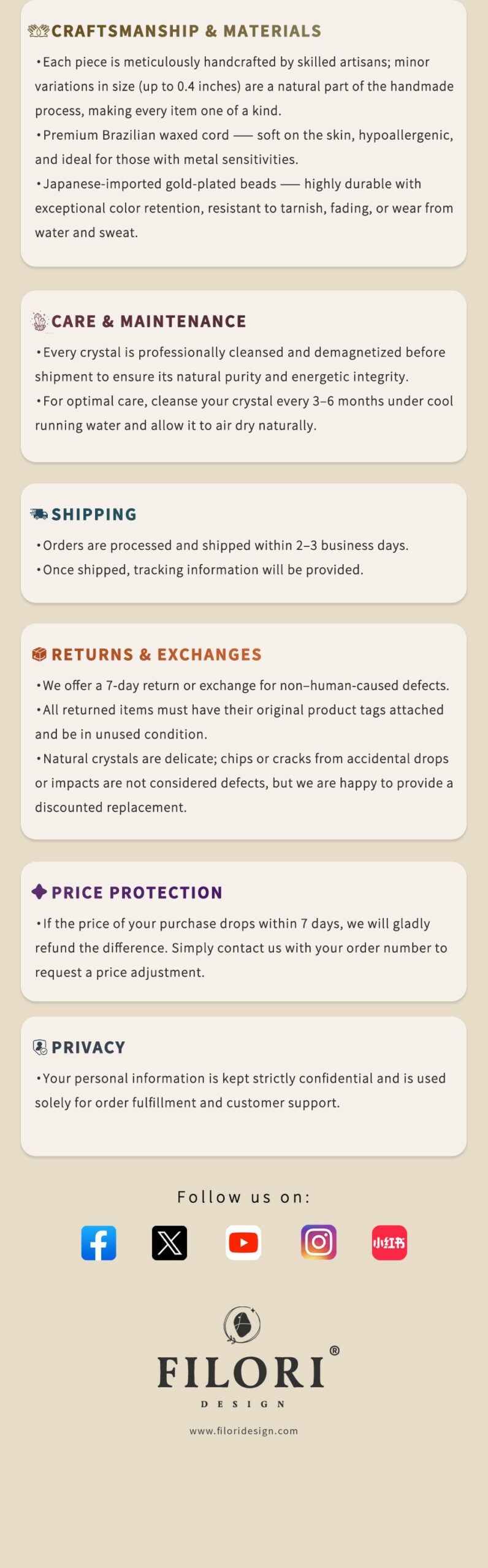 ✧ Material:100% natural crystal, approx. 0.78×0.98″(2 × 2.5 cm) ✧ Accent Bead:18 K gold-plated (Japan) ✧ Cord: Premium Brazilian wax cord, hand-braided ✧ Adjustable Length: Up to 23.6″ (60 cm), sliding knot design ✧ Packaging: Gift box & gemstone meaning card included