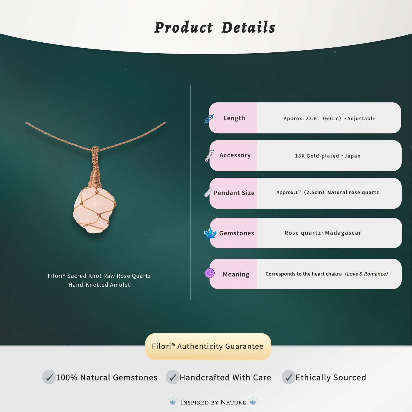 FILORI® Sacred Knot ·Rose Quartz Necklace Handcrafted · Inspired by the serenity of Tibet’s Lake Yamdrok