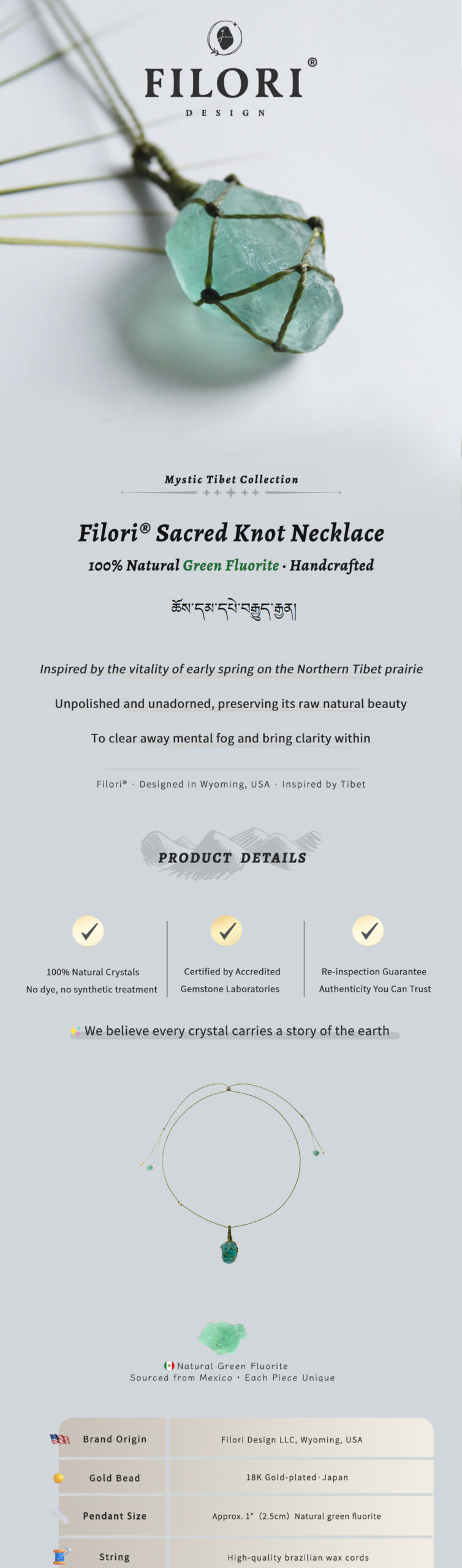 FILORI® Sacred Knot · Green Fluorite Necklace Handcrafted · Inspired by the spring on the Northern Tibet prairie