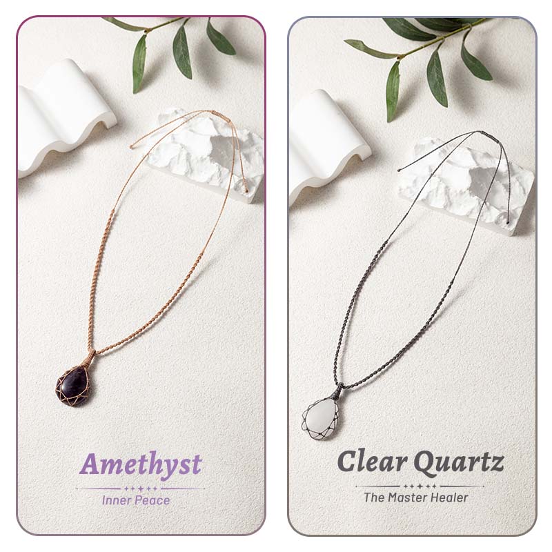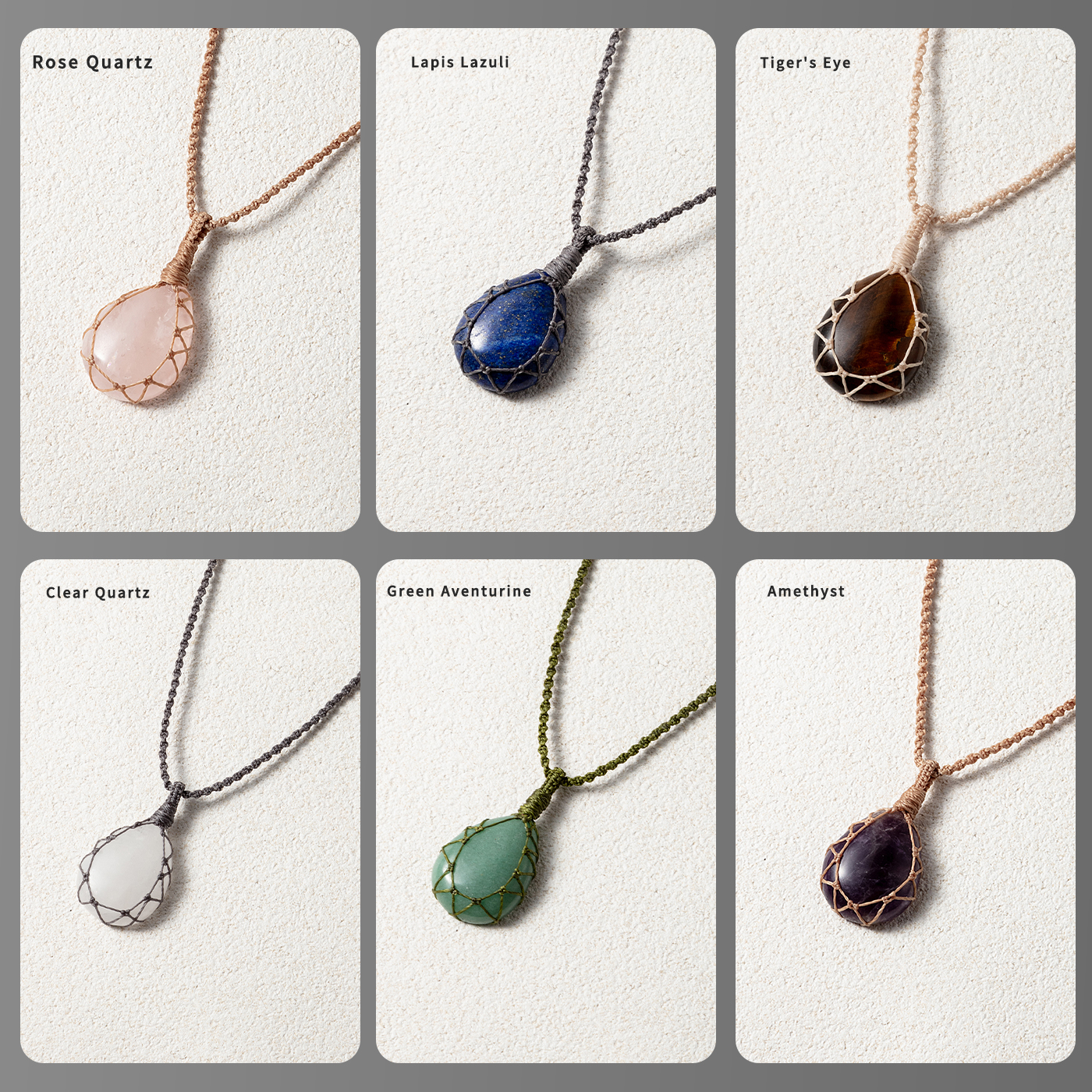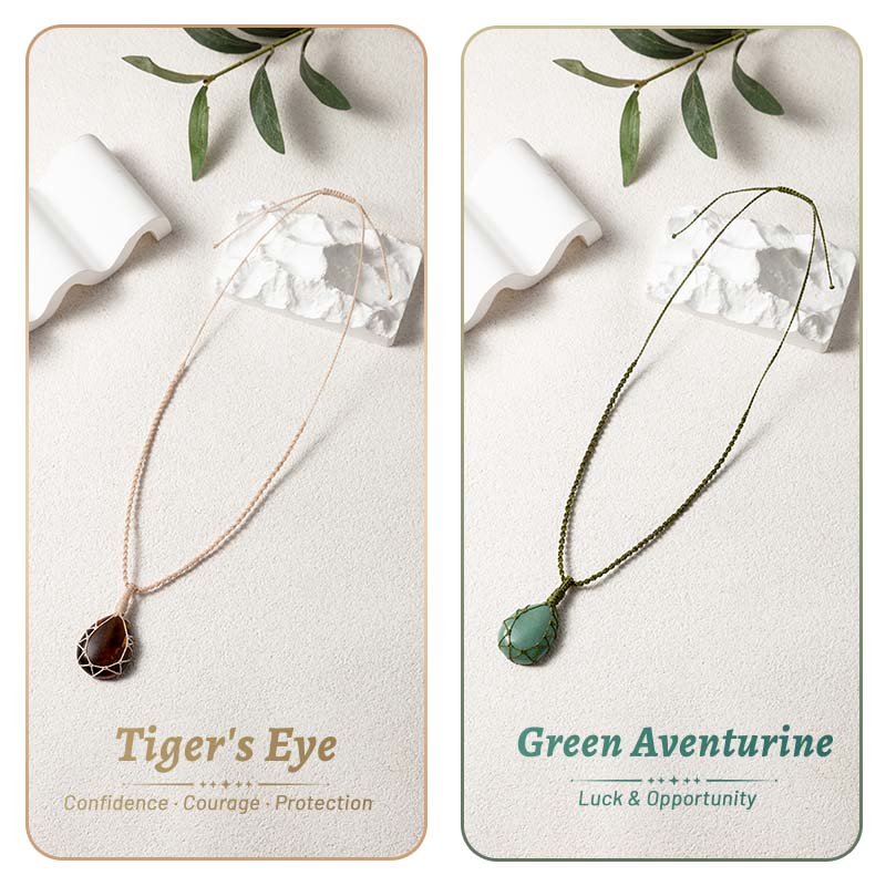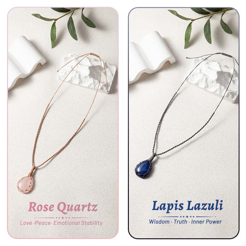 • Lapis Lazuli: Wisdom · Truth · Inner Power • Amethyst: Inner Peace · Intuition · Healing • Rose Quartz: Love · Compassion · Emotional Harmony • Clear Quartz: Clarity · Focus · Inspiration • Green Aventurine: Luck · Abundance · Growth • Tiger’s Eye: Confidence · Courage · Protection