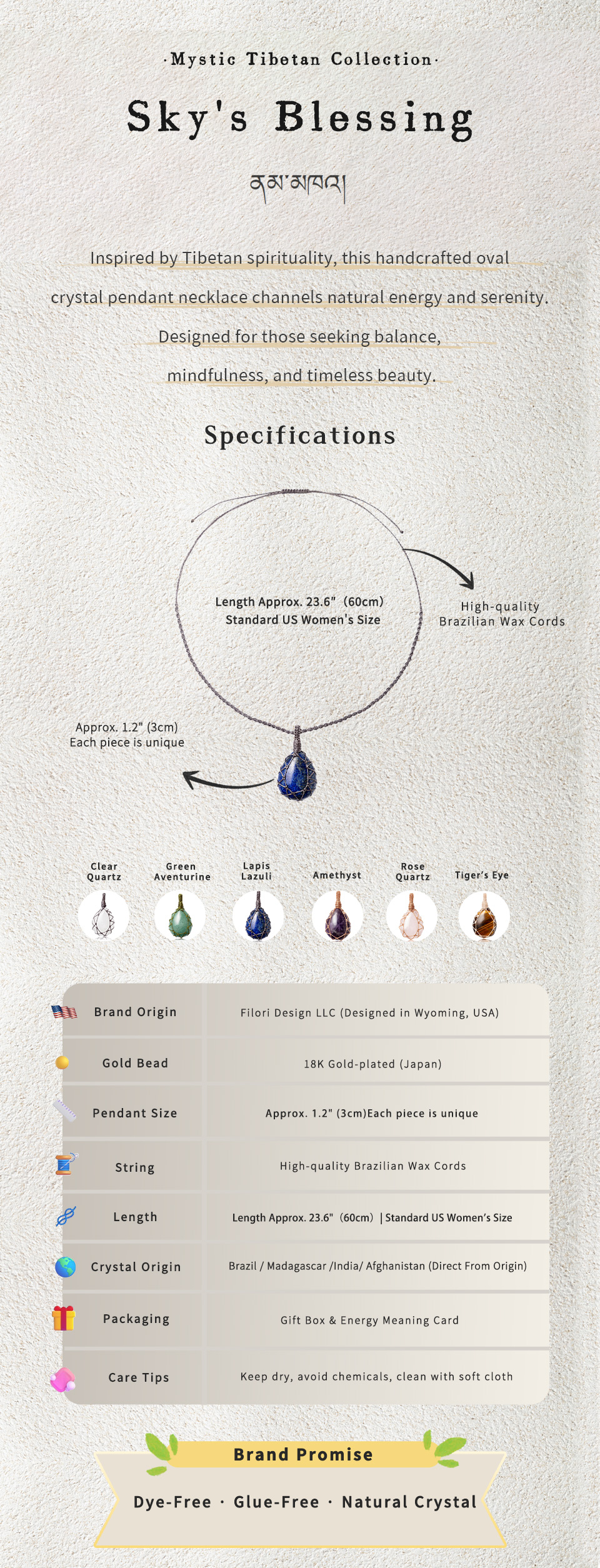 Origin: Designed in Wyoming, USA Crafted in both the U.S. and trusted overseas studios 30-Day Money-Back Guarantee Each Sky’s Blessing Necklace Collection is a one-of-a-kind talisman.