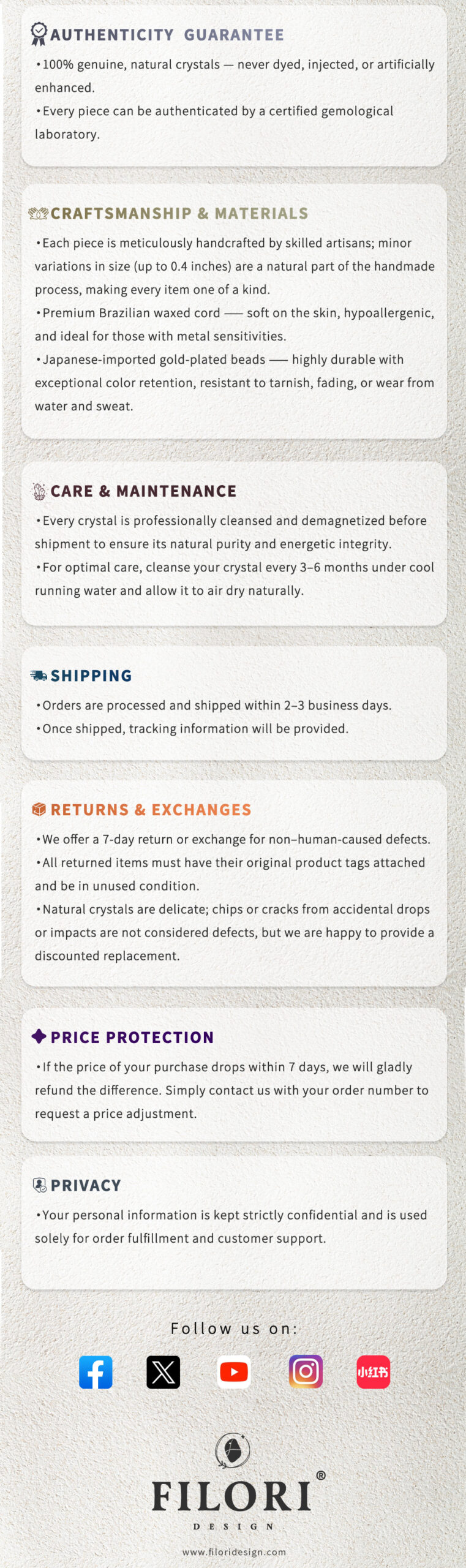 ✧ Material:100% natural (approx. 3.5cm x 2.5cm per pendant) ✧ Accent Beads:925 sterling silver (Japan) ✧ Cord: Hand-braided, premium Brazilian wax cord ✧ Adjustable Length: Approx. Up to 23.6″ (60cm), fits most ✧ Packaging: Comes with a gift box and energy meaning card