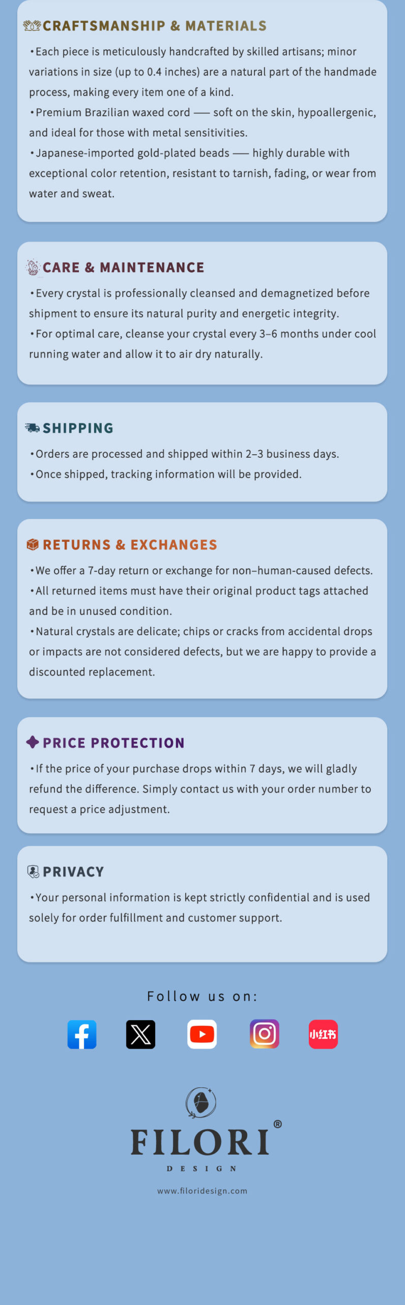 ✧ Material:100% Natural Crystals Thumbed Chips ✧ Accent Beads: 18K gold-plated (Japan) ✧ Cord: Premium Brazilian waxed cord. ✧ Adjustable Length: Approx. Up to 11.42″ (29cm) ✧ Packaging: Comes with a gift box and energy meaning card